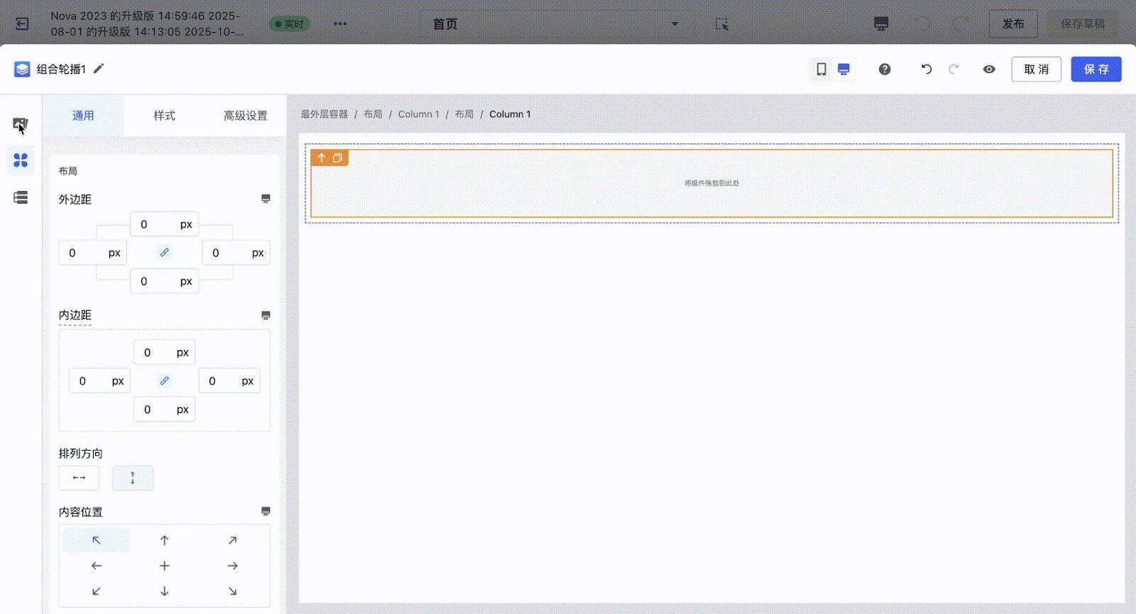 3. 点击通用 > 布局 > 选择单一布局,长按拖动至页面,再点击 Column 1 ,在 Column 1 层级中继续选择单一布局,长按拖动至页面。