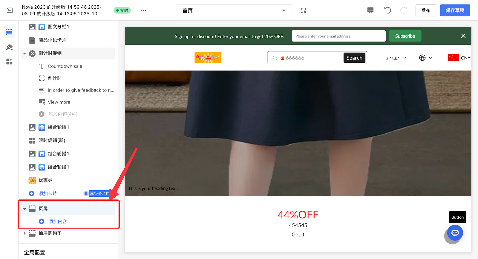 2. 为防止 Page Builder 配置的页尾菜单和主题自带的页尾菜单重复,建议您点击可将主题自带的页尾关闭。即点击底部【页尾】卡片,关闭【开启版权】按钮,删除【隐私条款菜单】下关联的菜单。