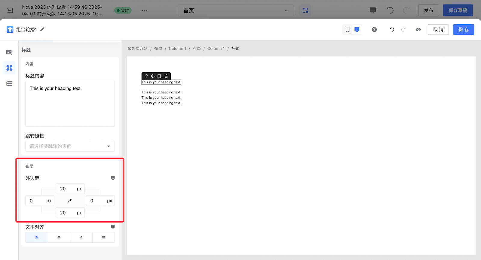 - 对于区分一级菜单和二级菜单,您可以调整标题的上下边距,为了美观,建议您只调整上下边距,左右边距调整为0。