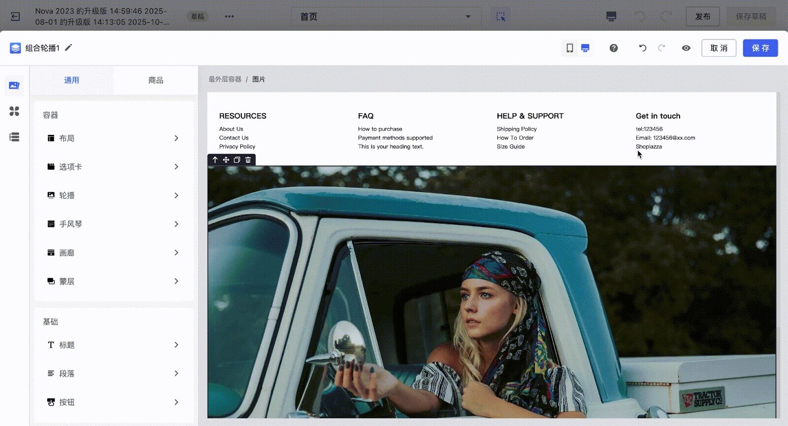 9. 除基本的菜单内容外,在高级卡片中还可支持增加logo、图片的展示,可以在布局组件下方,添加图片组件,插入对应的图片,提升互动效果,增加品牌信赖感。