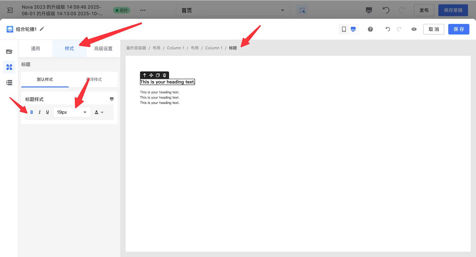 5. 点击标题层级 - 样式,编辑您的标题内容,您可以将一级菜单加粗,调大字体和二级菜单区分开。