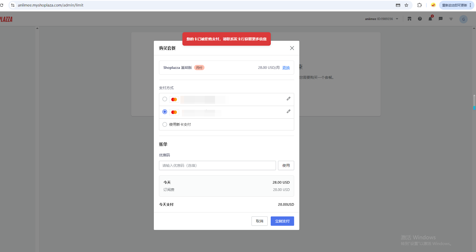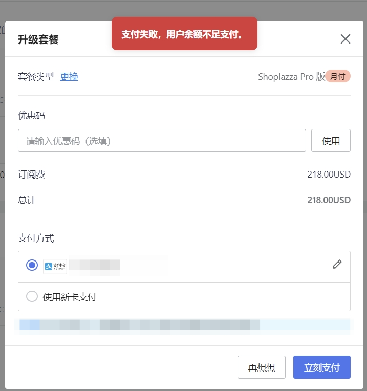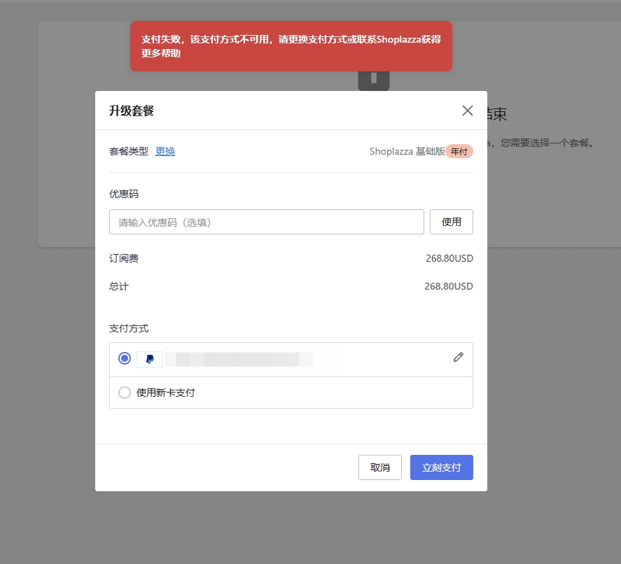 2. 提示【扣款异常,请稍后重试】、【支付失败,该支付方式不可用,请更换支付方式或联系Shoplazza获得更多帮助】