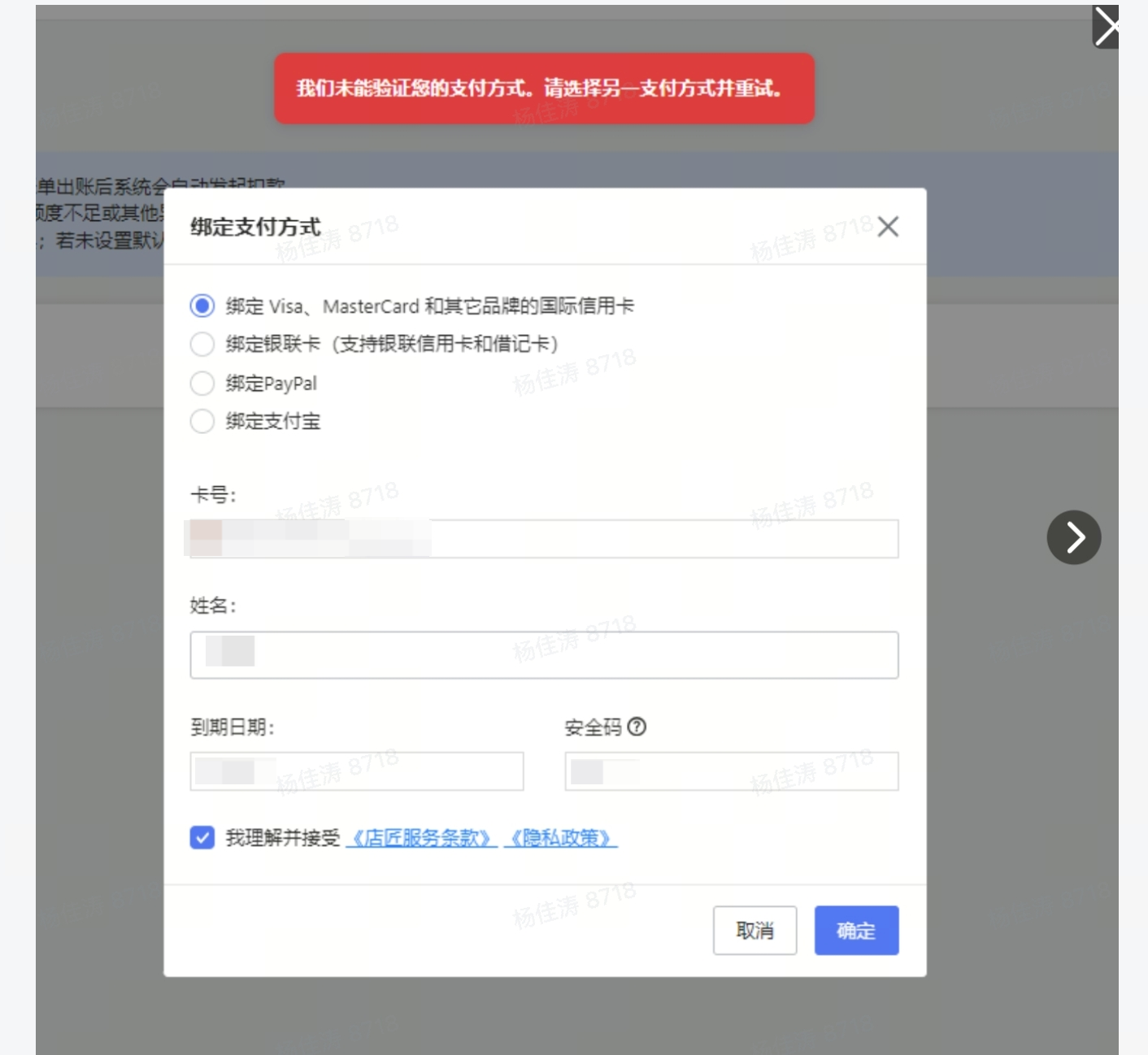 2. 提示【绑定支付方式失败,请重新绑定】 、【我们未能验证您的支付方式。请选择另一支付方式并重试。】