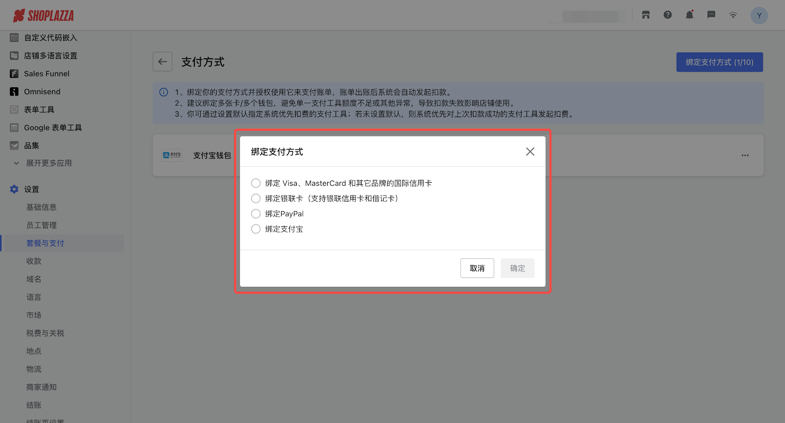 如检查后仍未成功绑定或支付,请联系 Shoplazza 客服获取帮助。