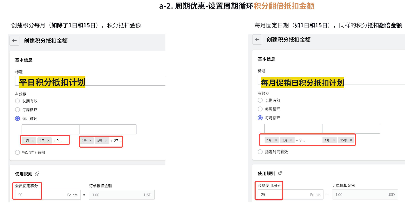 2. 设置多个积分兑换计划,如400分兑换$20 OFF,800分兑换全单5% OFF。