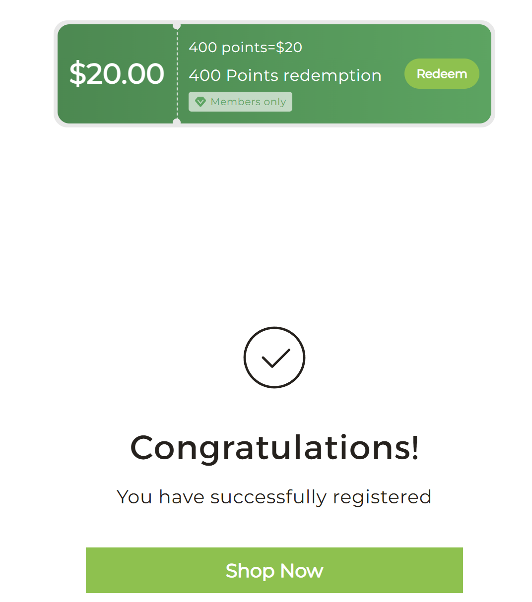 当成功注册入会,跳转页面如下图,显示可用入会奖励的400积分,兑换“减价$20”的优惠。点击Redeem,即可跳转兑换。