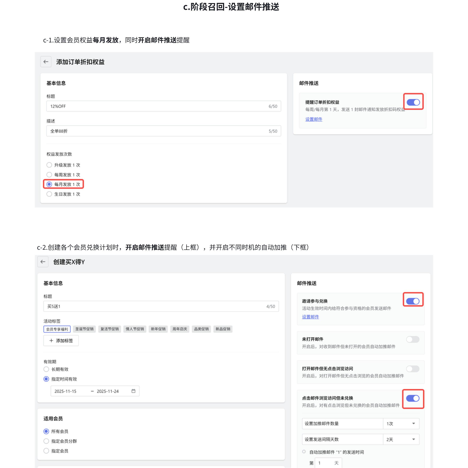 阶段C:通过配置邮件推送和自动加推功能,实现会员权益与促销活动的定期触达。