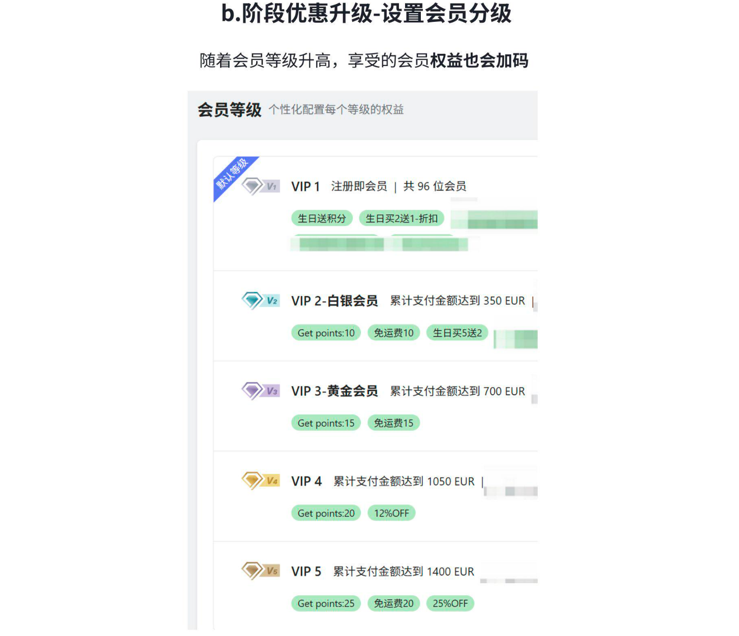 阶段B:通过设置会员等级,实现基于累计消费金额的权益升级机制:随着会员等级提升,用户可享受更高比例的积分返还、免运费、生日专属优惠及购物折扣等差异化权益。
