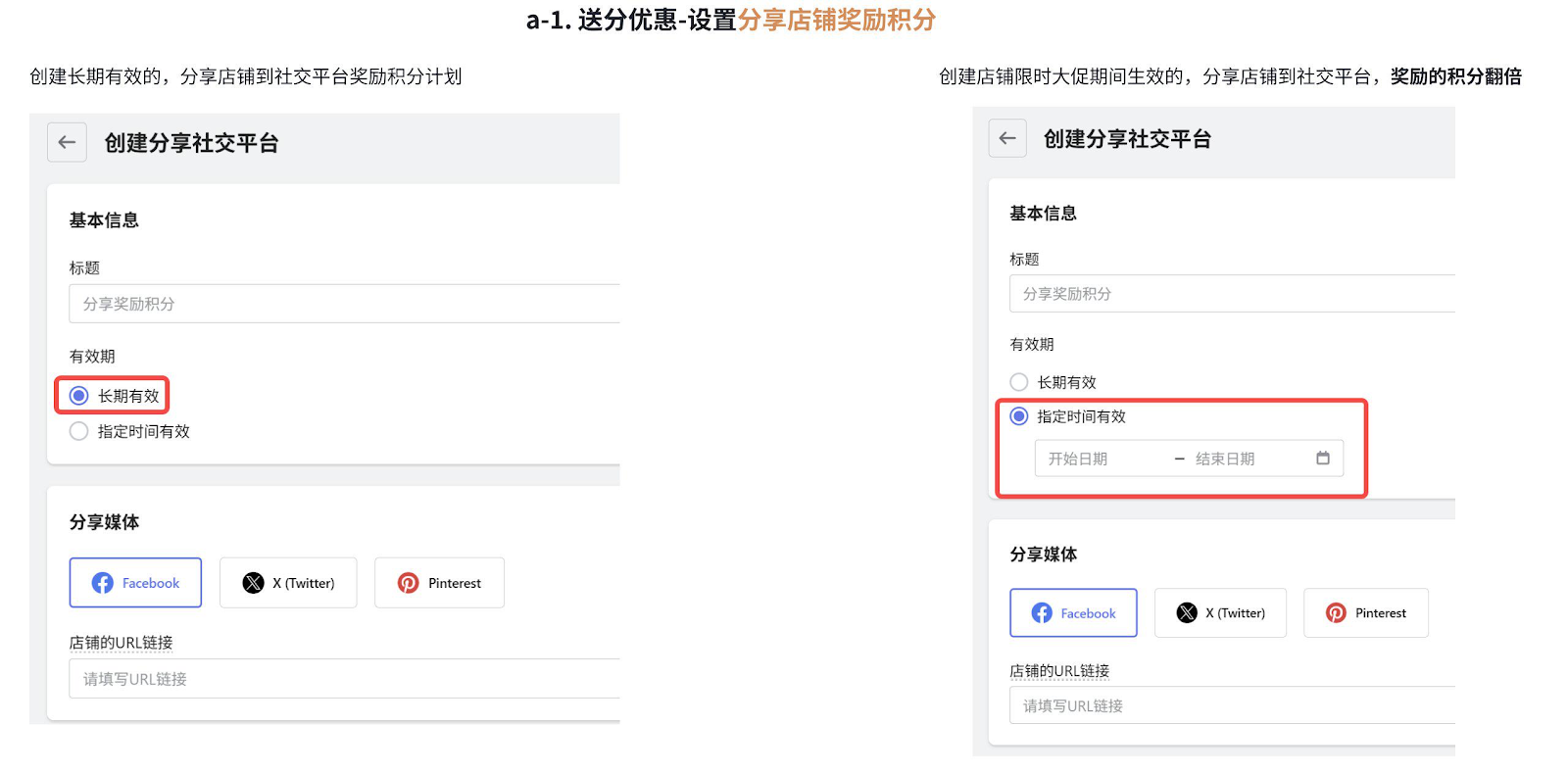 阶段A:通过设置分享店铺的奖励积分(支持长期或限时有效),引导用户在社交平台主动分享店铺,在日常运营或大促期间放大传播效果,持续或集中提升店铺曝光与引流能力。