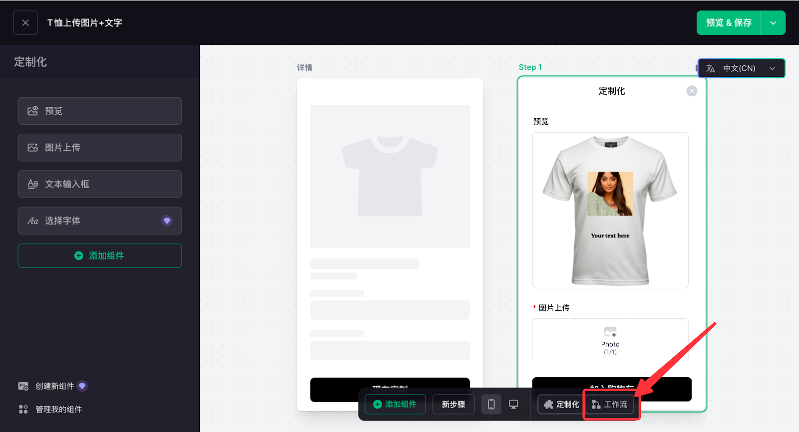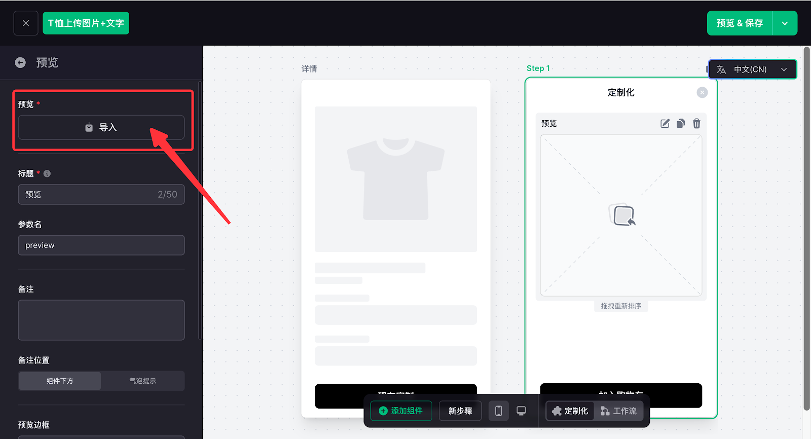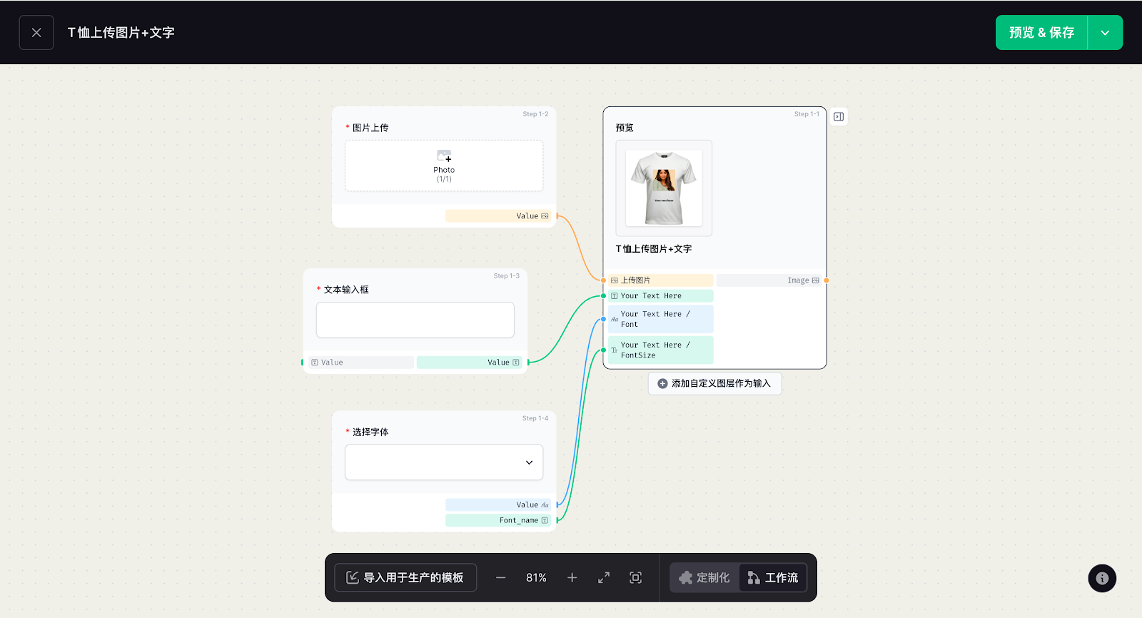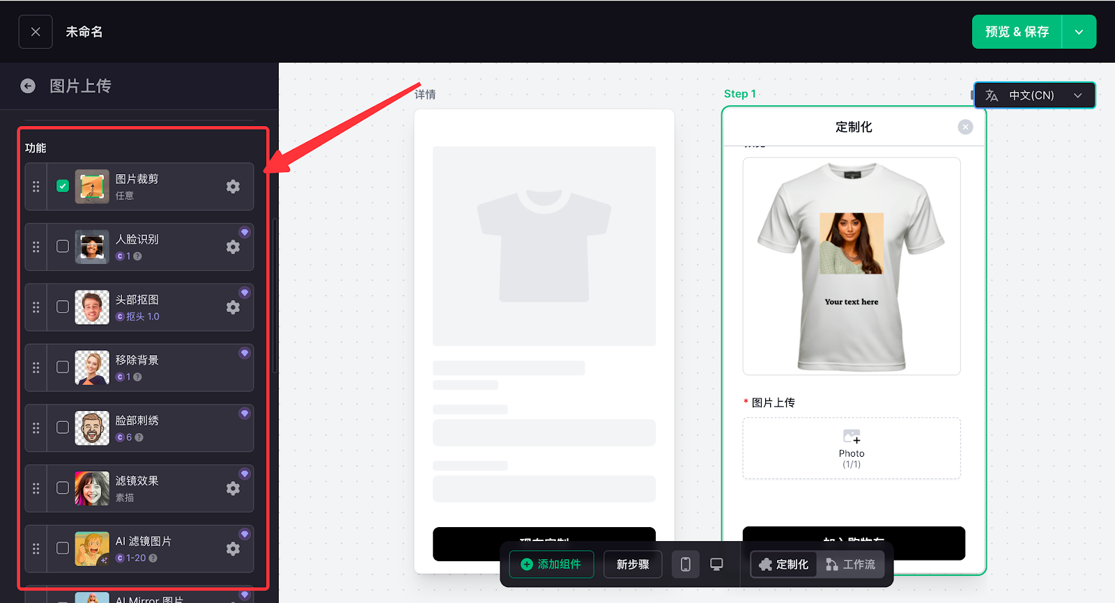 定制功能配置的核心是搭建客户在前台的实操交互逻辑,通过添加图片上传、文字输入、字体选择等功能组件,再在工作流中完成数据关联,让客户的操作内容实时生成预览效果,打造直观的定制体验。这一环节直接决定定制流程的实操性,也是实现个性化交互的关键核心步骤。