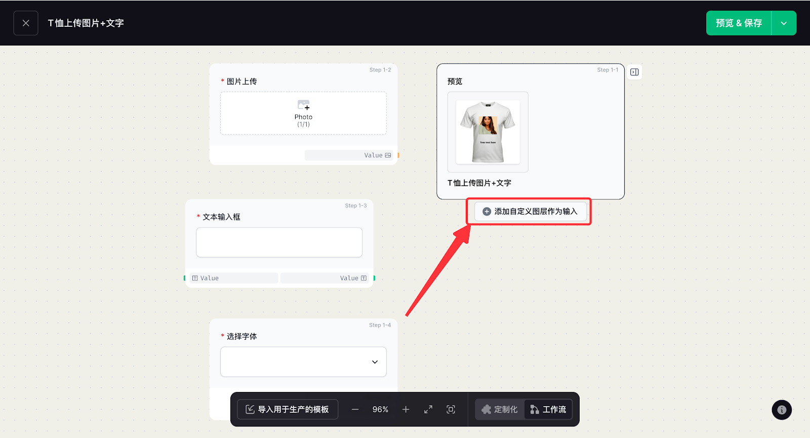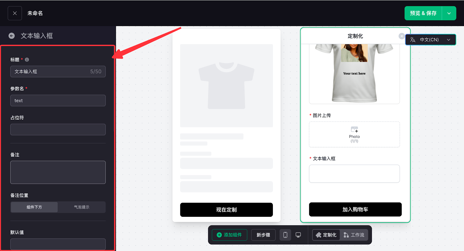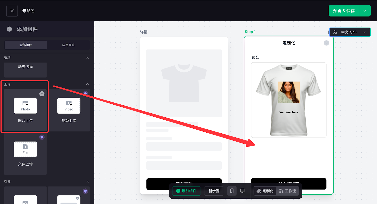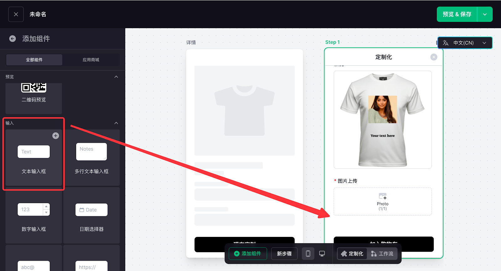 定制功能配置的核心是搭建客户在前台的实操交互逻辑,通过添加图片上传、文字输入、字体选择等功能组件,再在工作流中完成数据关联,让客户的操作内容实时生成预览效果,打造直观的定制体验。这一环节直接决定定制流程的实操性,也是实现个性化交互的关键核心步骤。