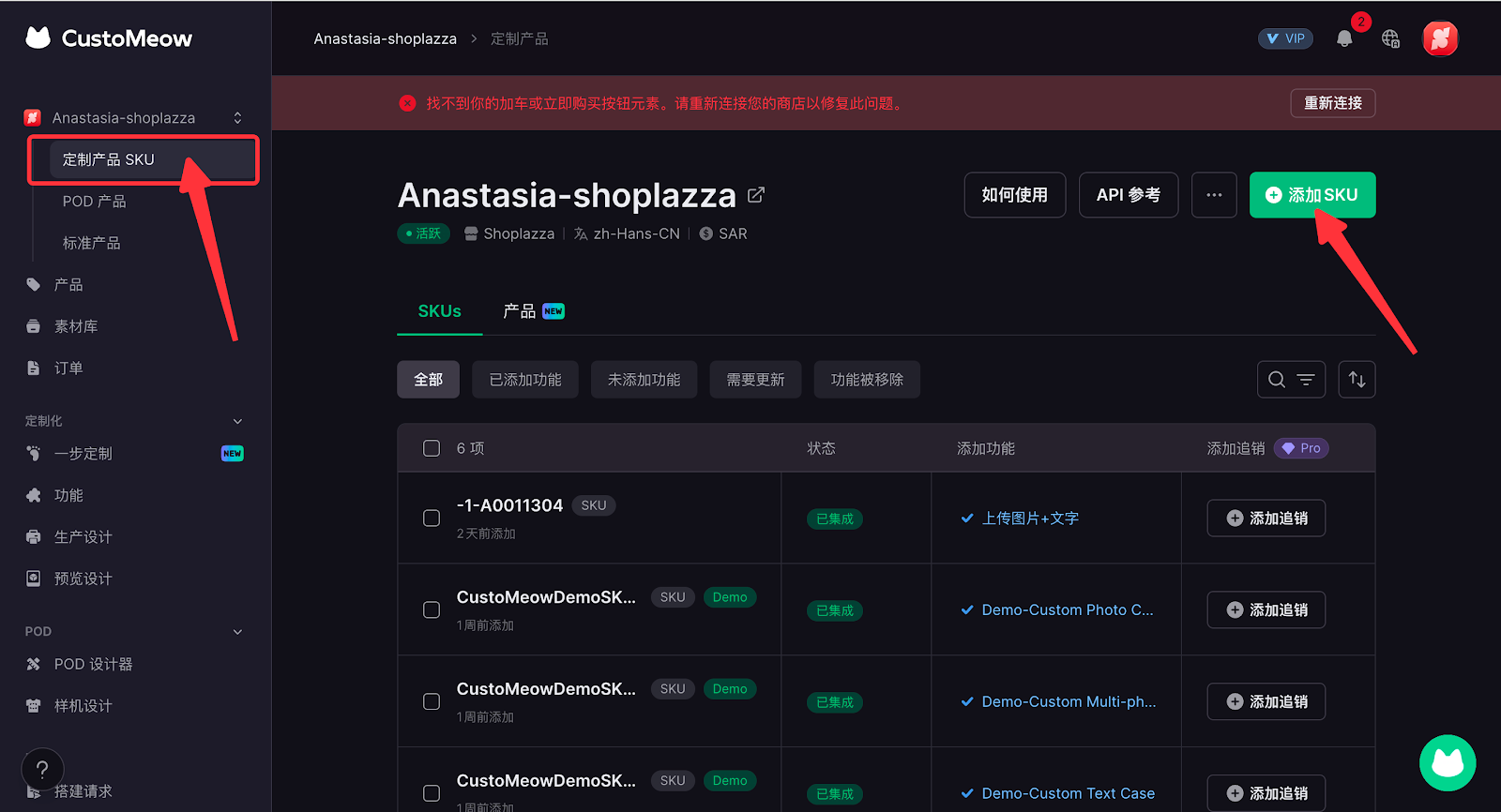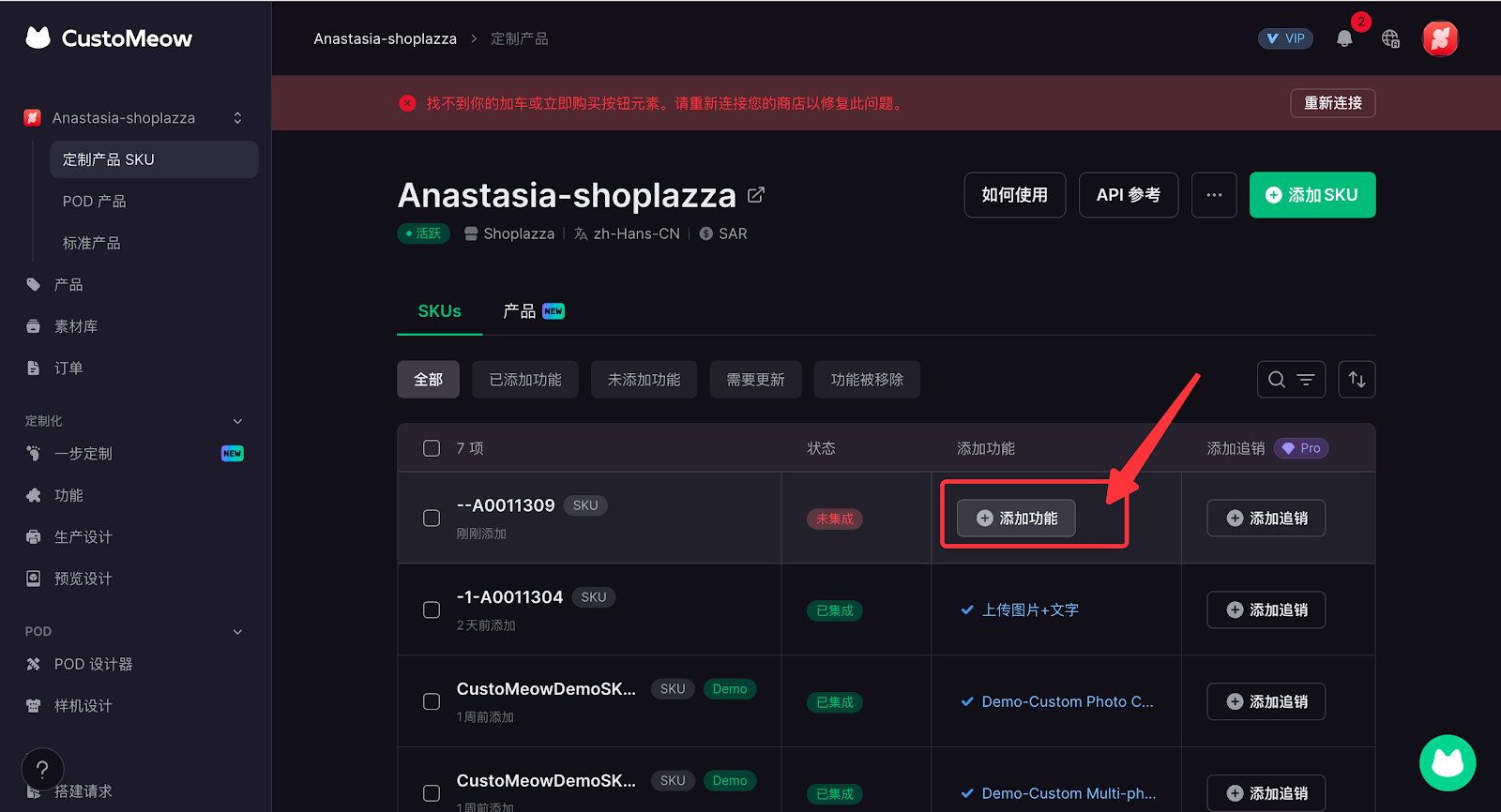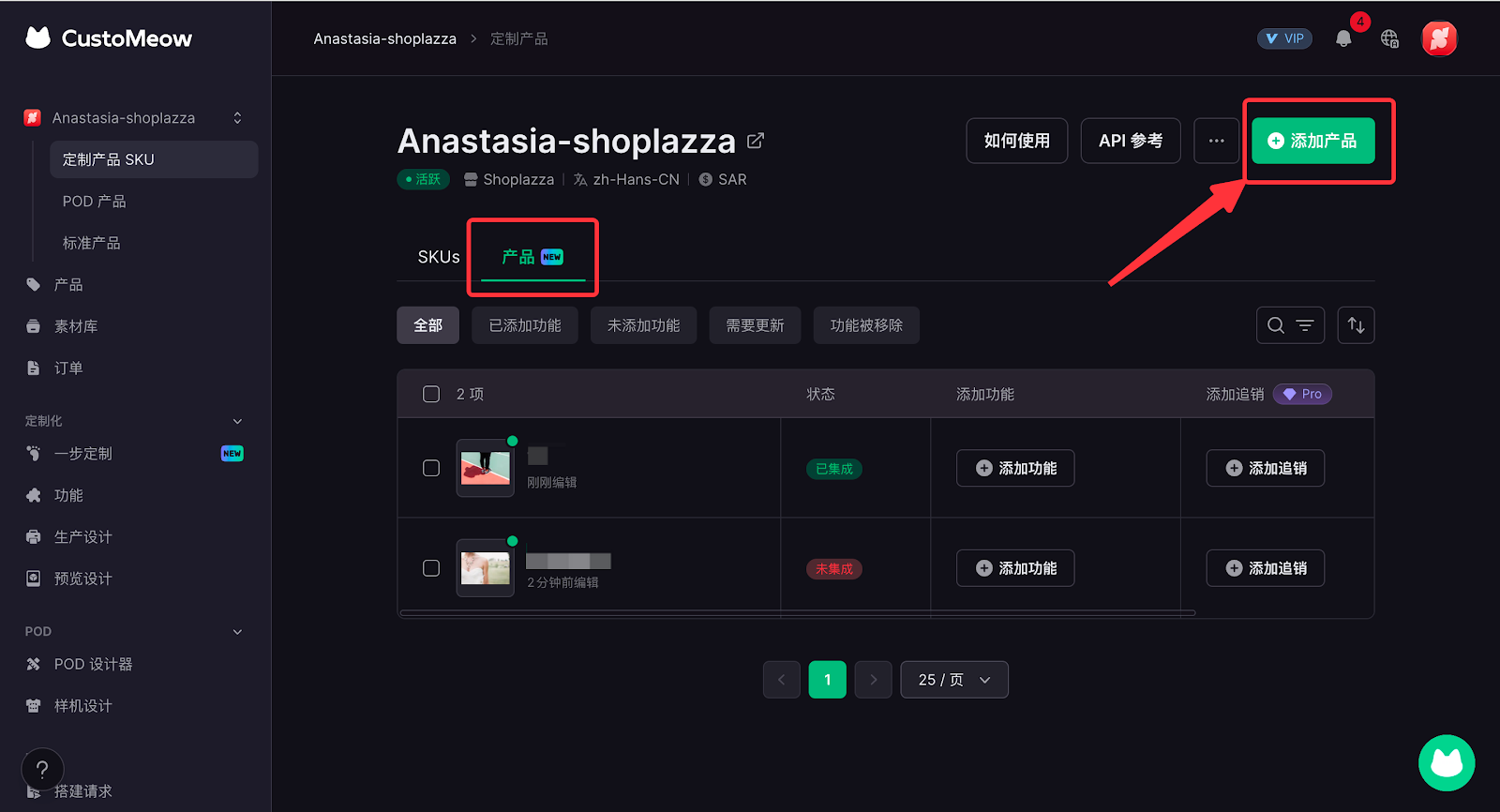 - 如您的商品有多个SKU,各SKU都可支持定制,您可以点击产品,添加对应产品即可。