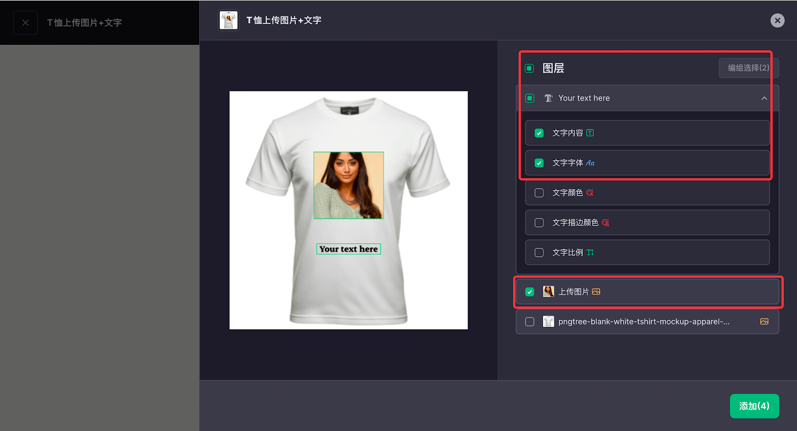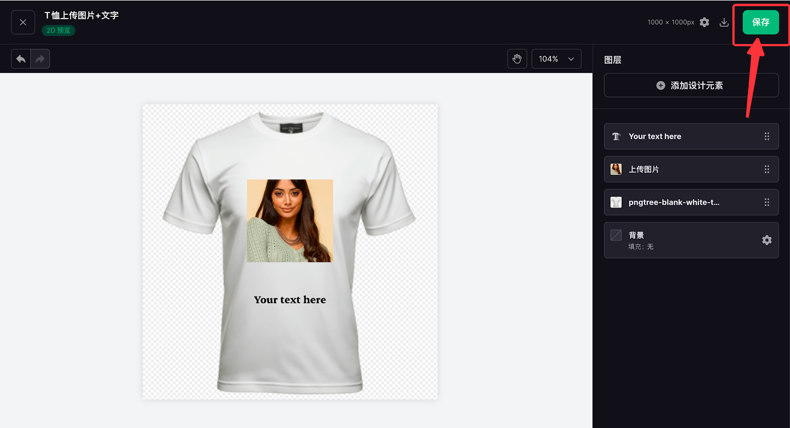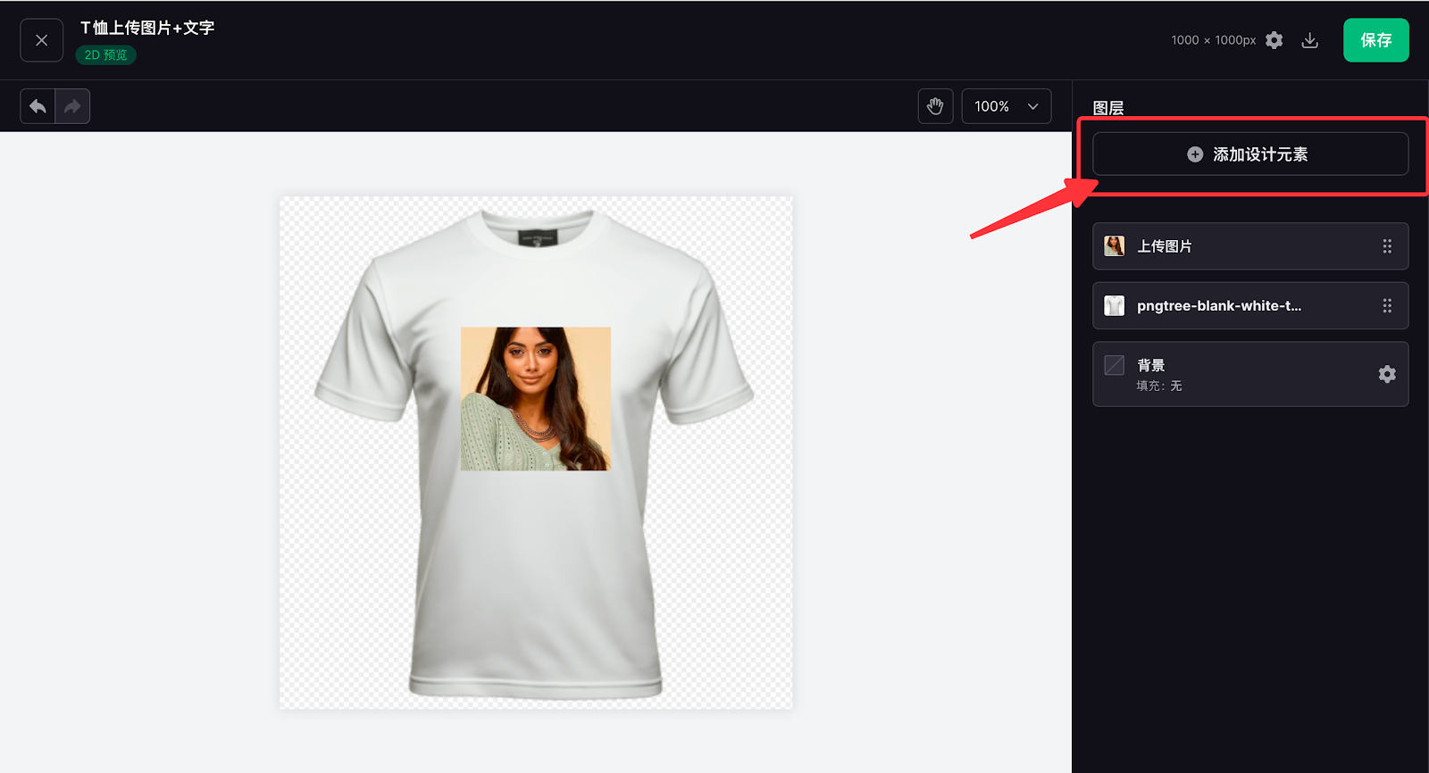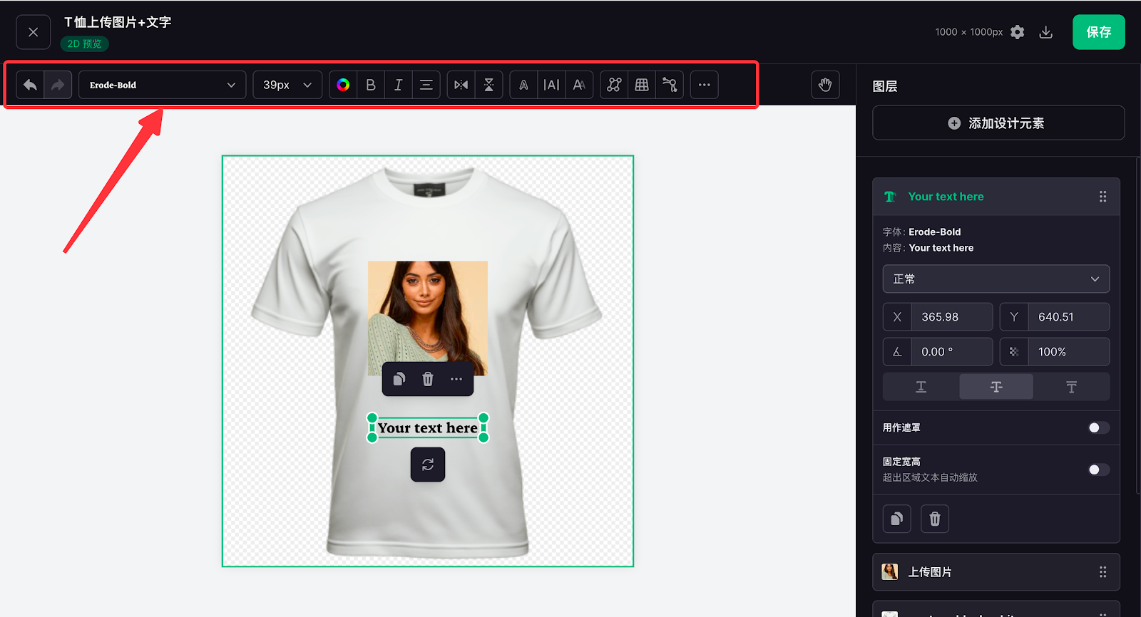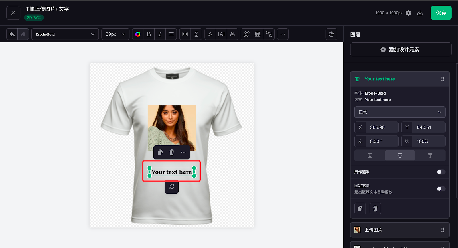 7. 此次T恤定制只需要上传图片,不做其他处理,因此将素材拖入完成后,即可进行其他内容的设计,点击添加设计元素配置自定义文字内容,同样可拖动至您需要的位置。