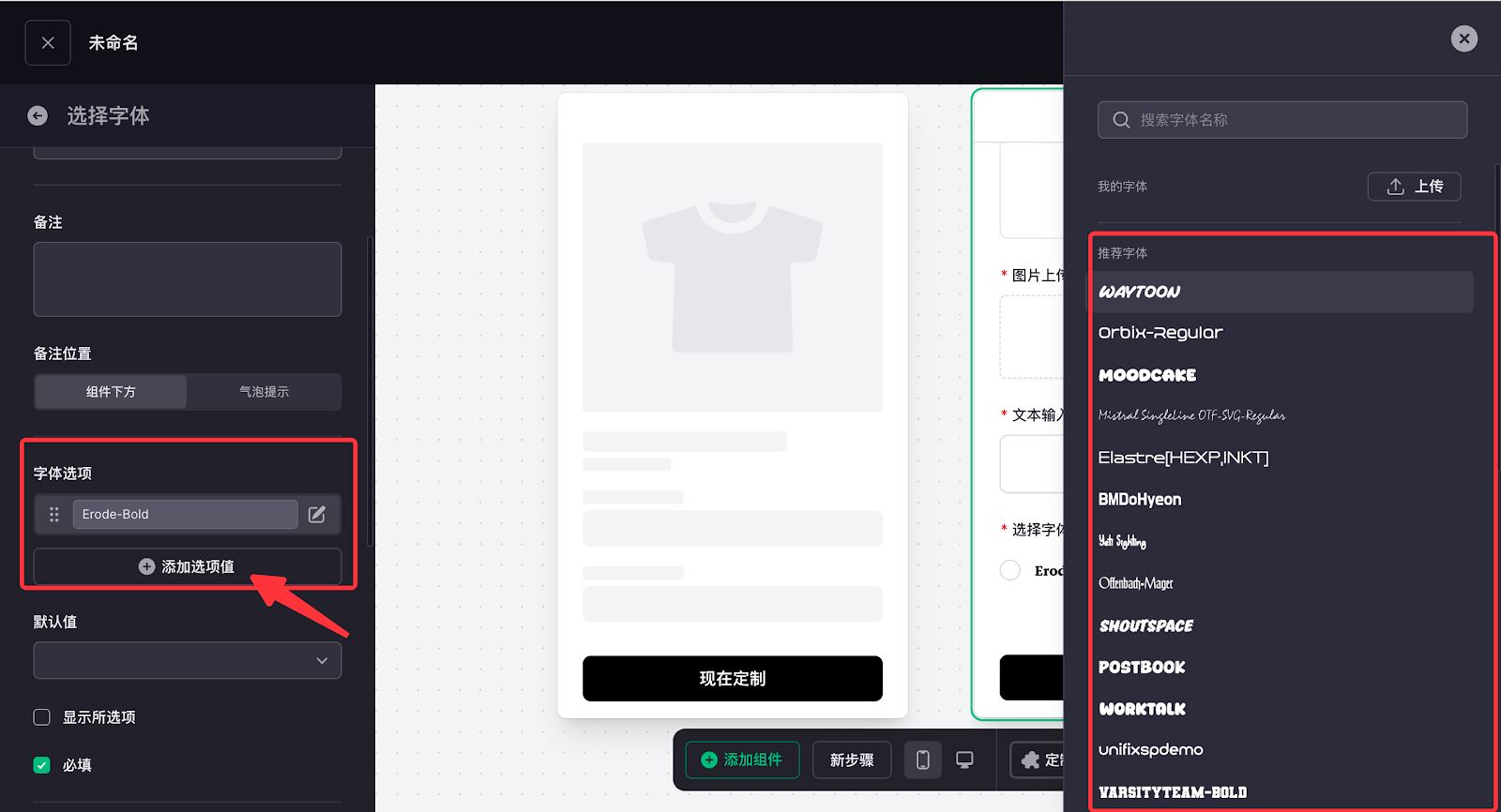 8. 在字体选项中点击添加选项值可添加各类字体样式。