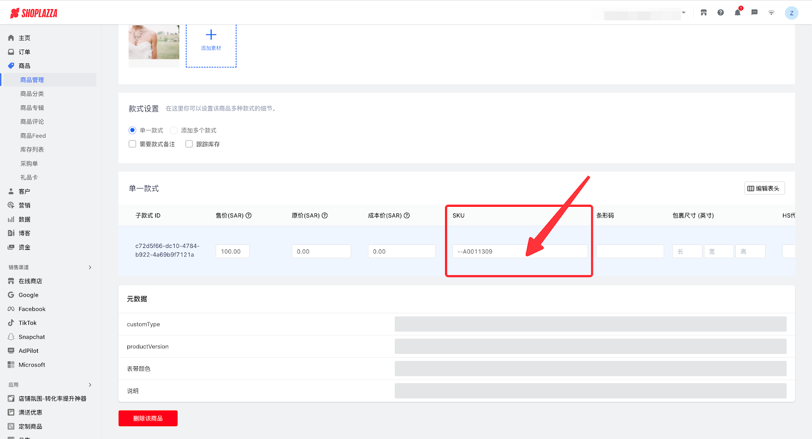 1. 登录您的Shoplazza管理后台 > 商品,点击进入对应商品,配置商品SKU信息,复制该SKU信息。