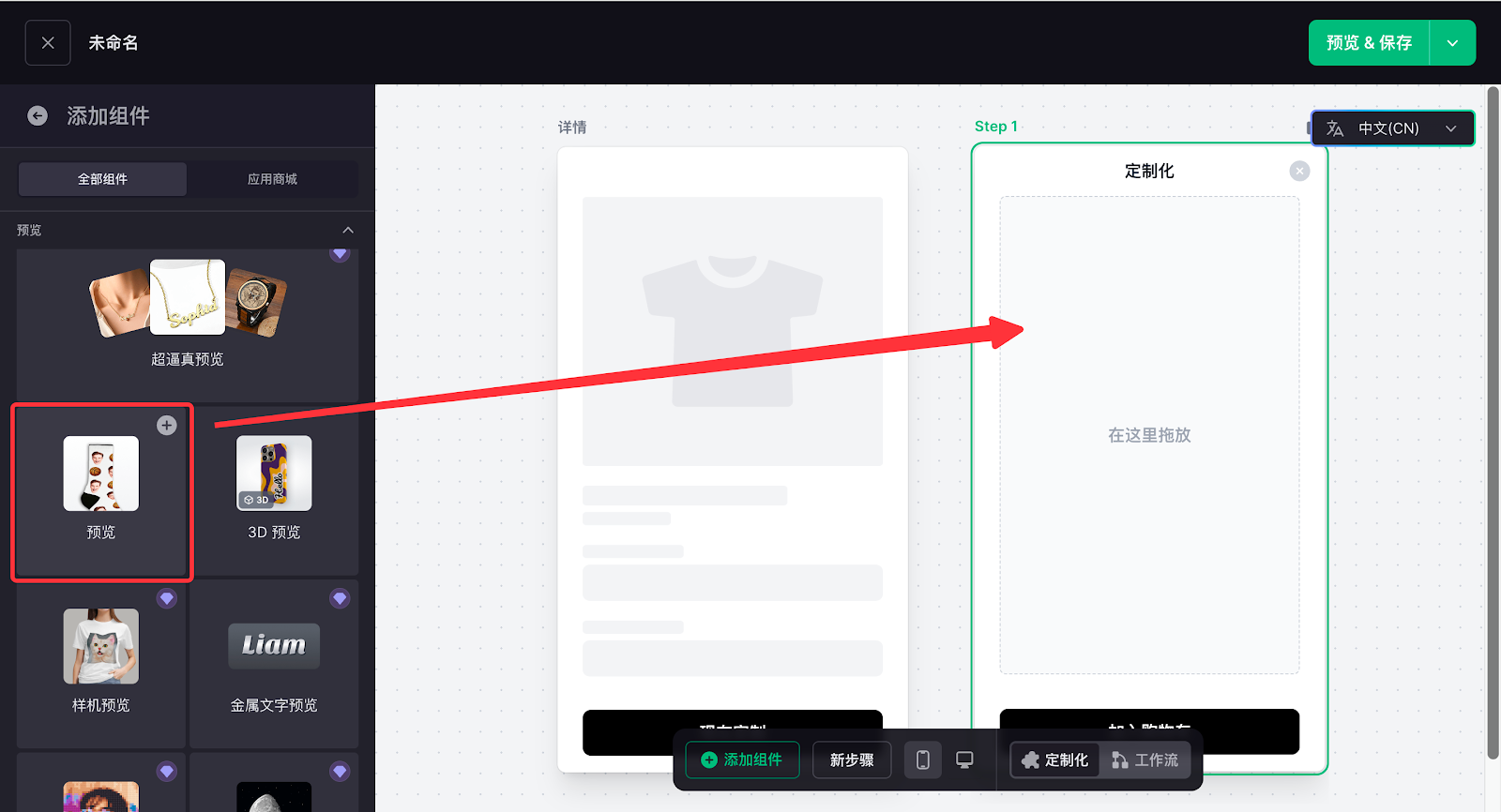 2. 向页面中拖入预览组件,导入已设计好的定制项。