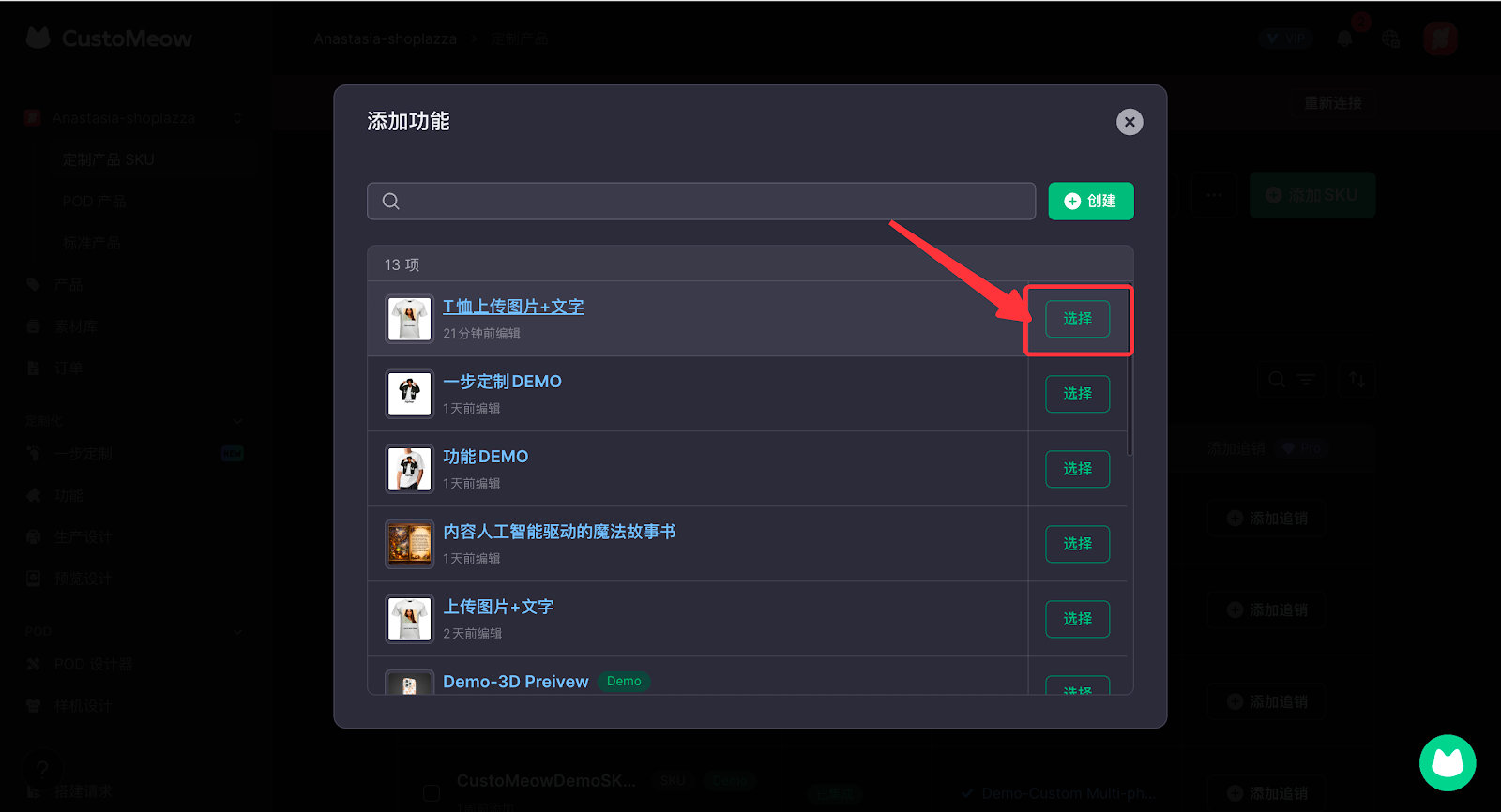 3. 接着点击添加功能,选择刚刚制作好的定制功能,这样即可成功为您的商品集成定制功能。