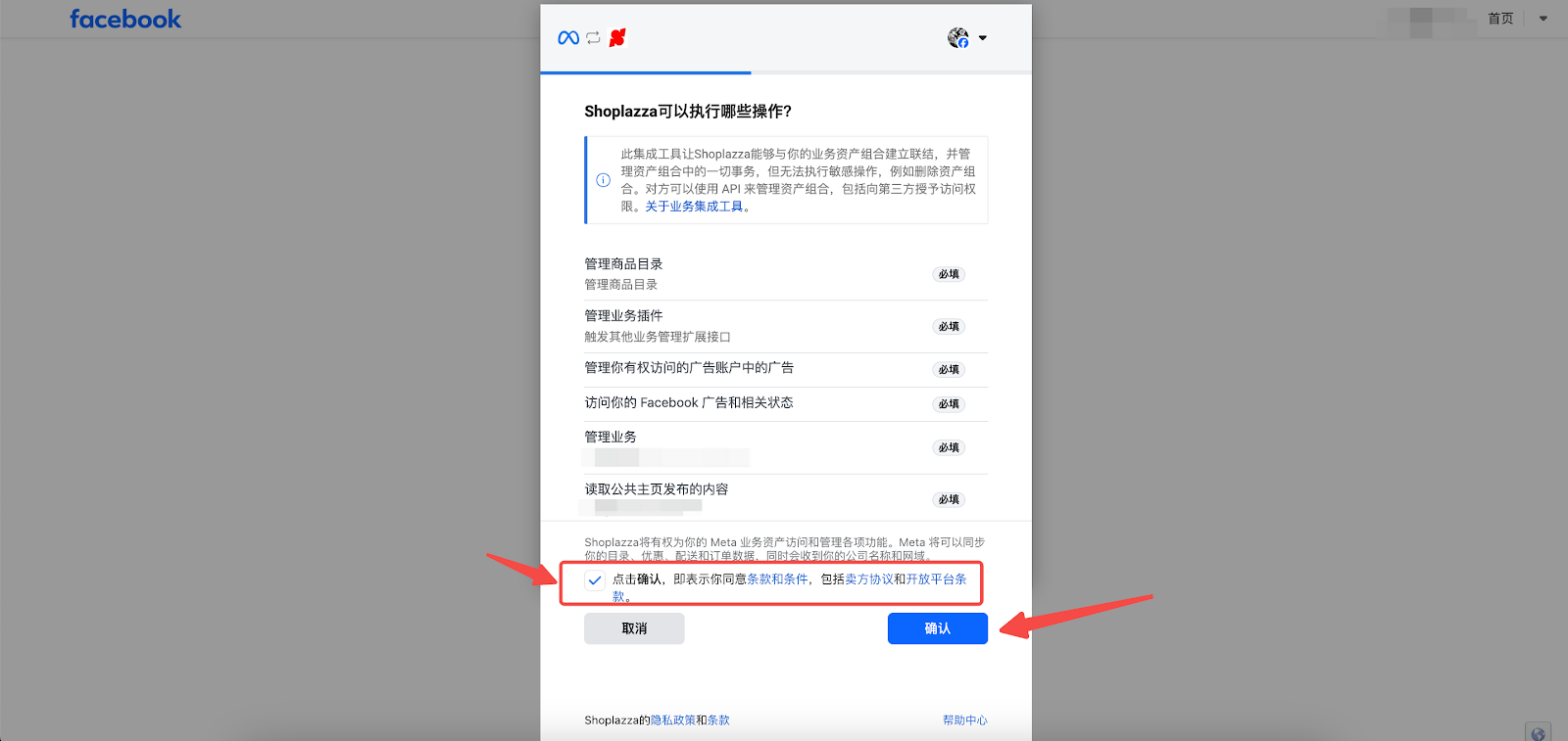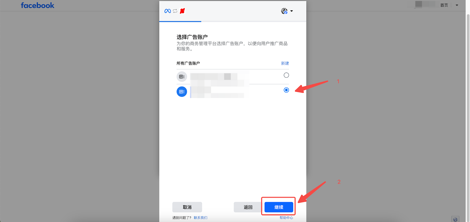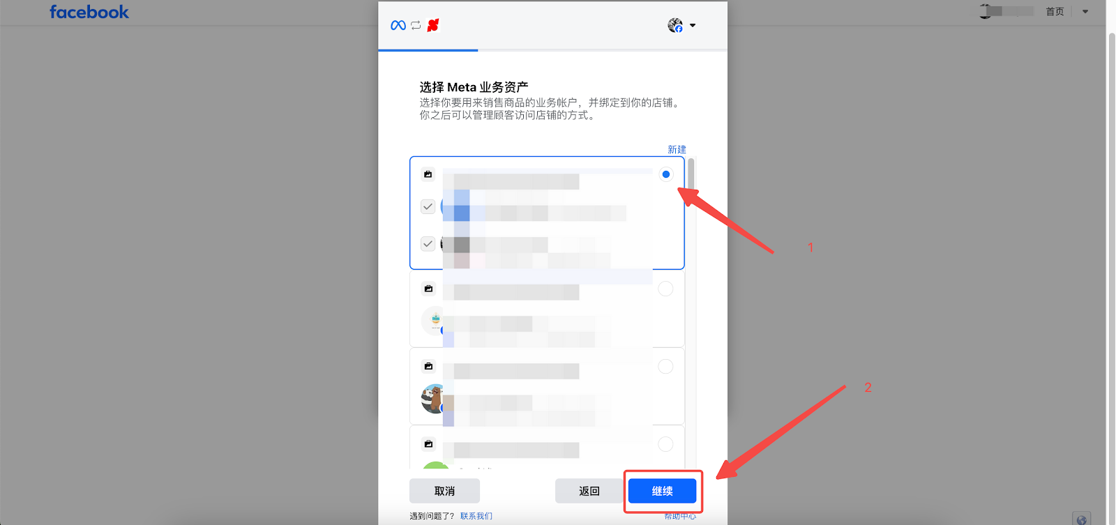 4. 选择您想要关联的 Meta 业务资产,点击【继续】。