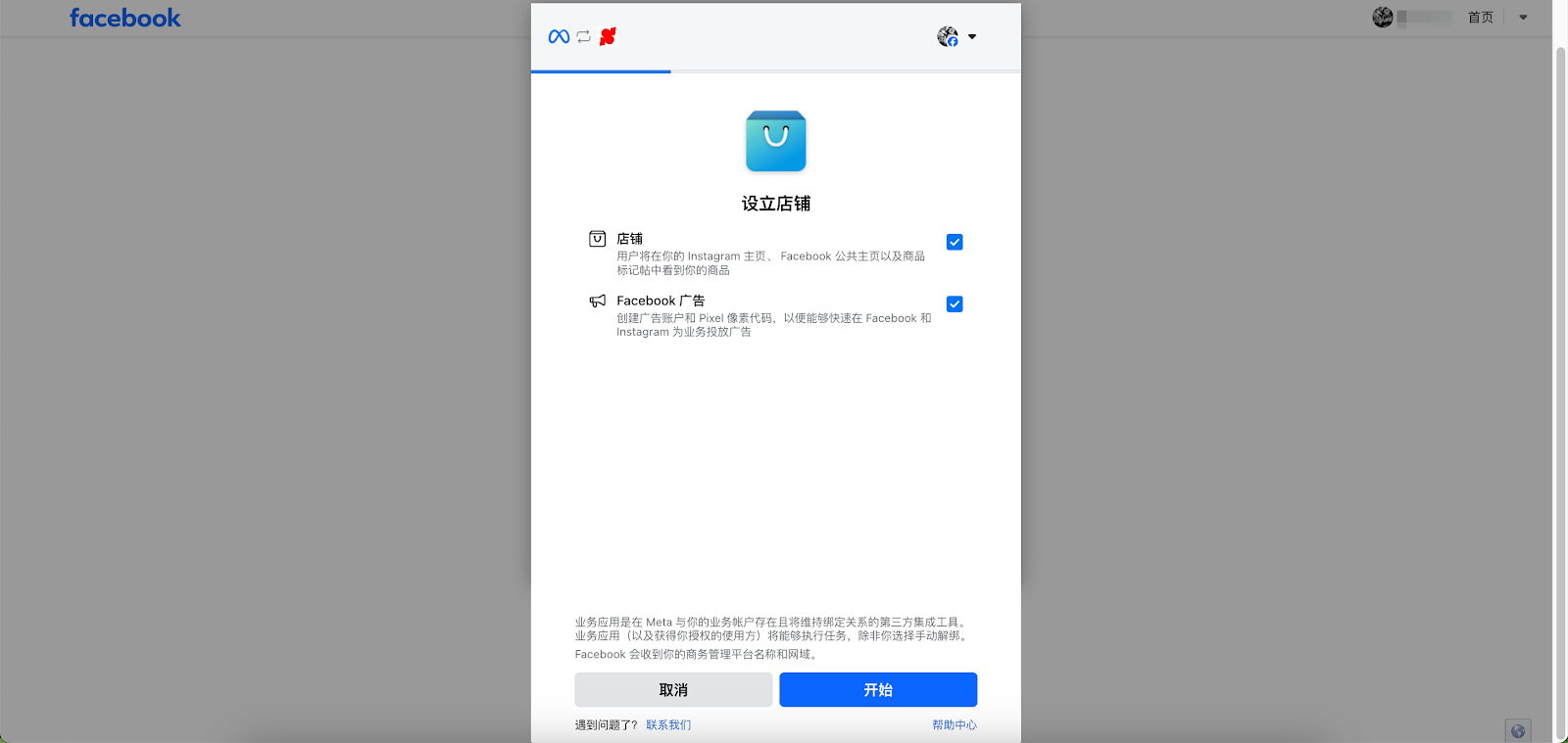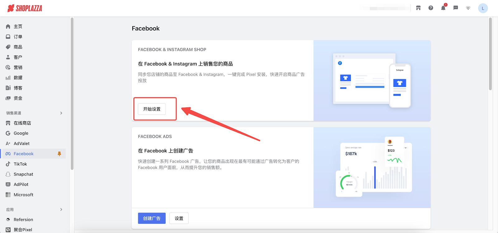 2. 点击 Facebook & Instagram Shop 模块的【开始设置】按钮,即可进行相关资产授权。