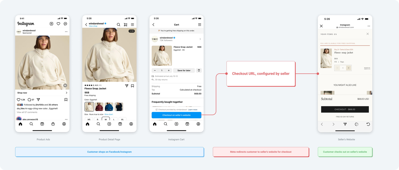 - 商品同步完成后,支持直接在 Facebook 或 Instagram Shop 进行销售,我们会为您自动设置结账页链接,引导用户至独立站完成结账。结账流程如下图所示。