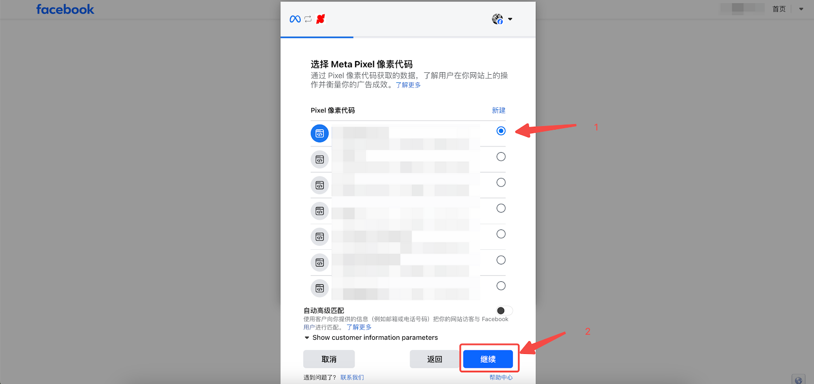 6. 选择您想要添加的像素代码,点击【继续】。