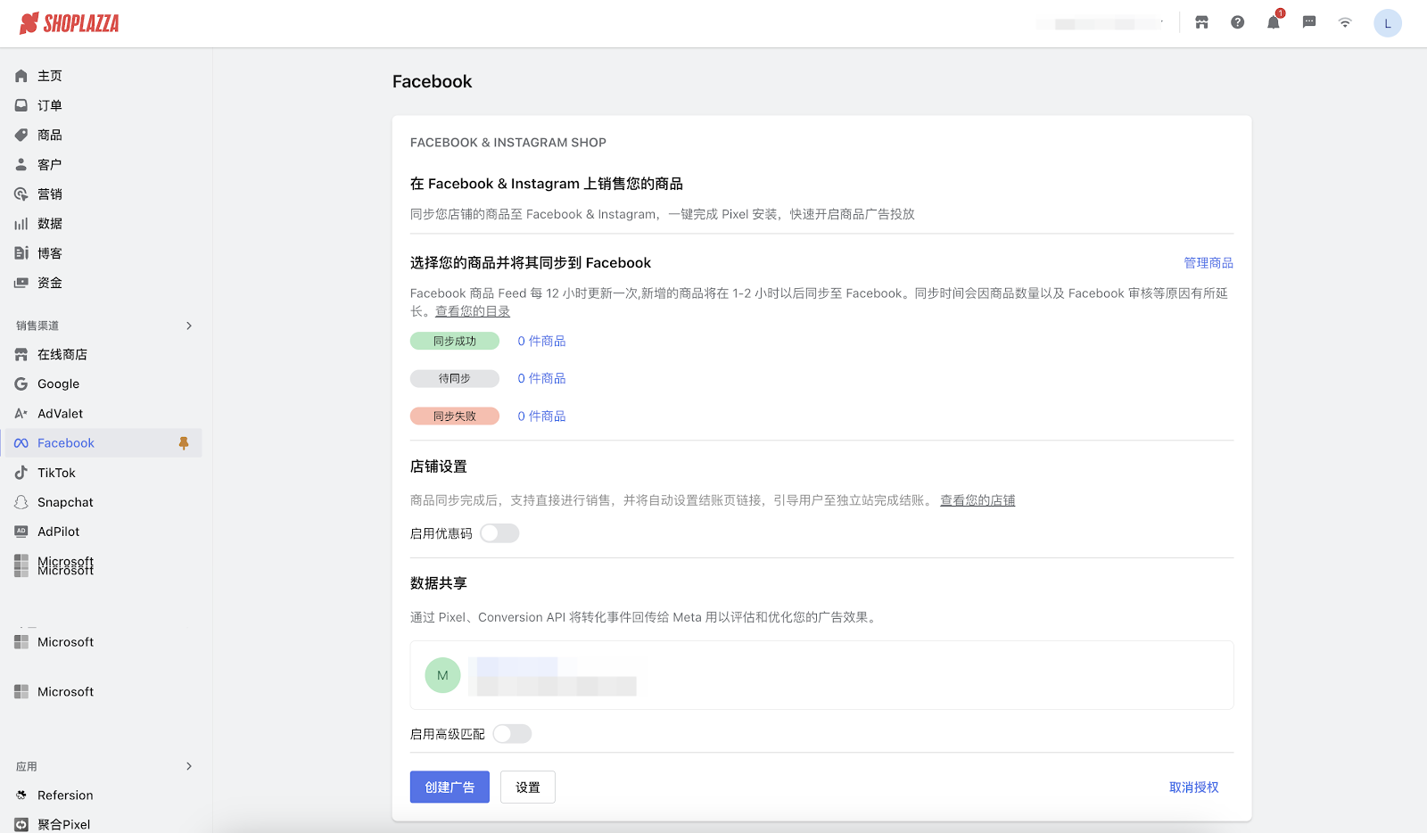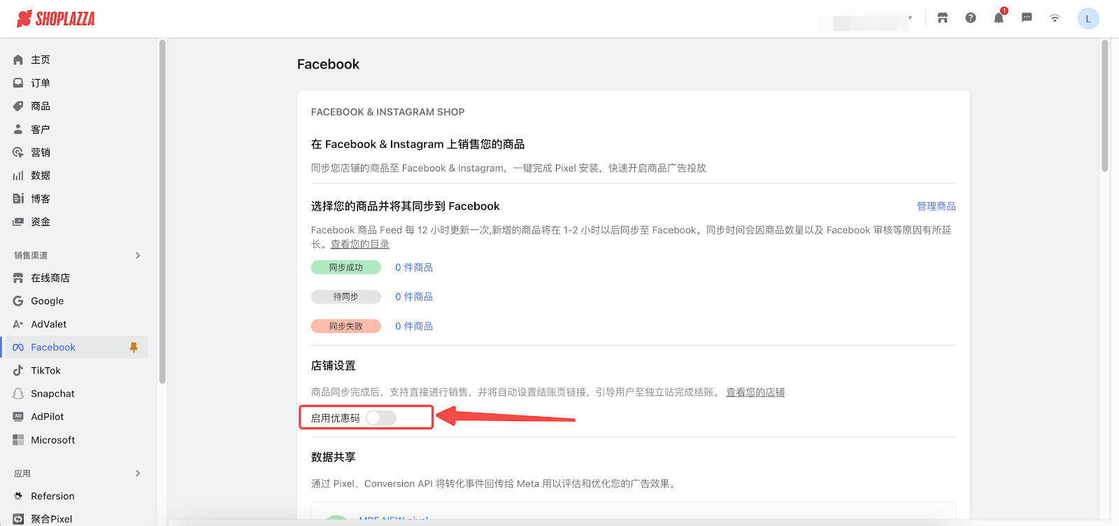11. 您可以手动打开「启用优惠码」开关,开启后,您店铺后台的优惠码信息将会同步至你所关联的 Meta Shop。