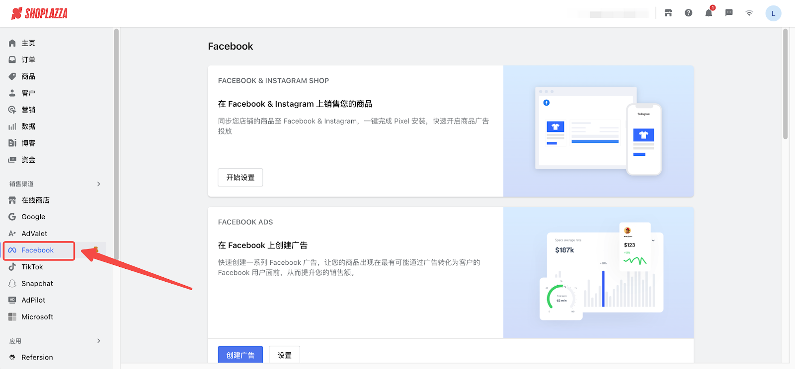 1. 登录您的 Shoplazza 管理后台,点击销售渠道下的 Facebook。