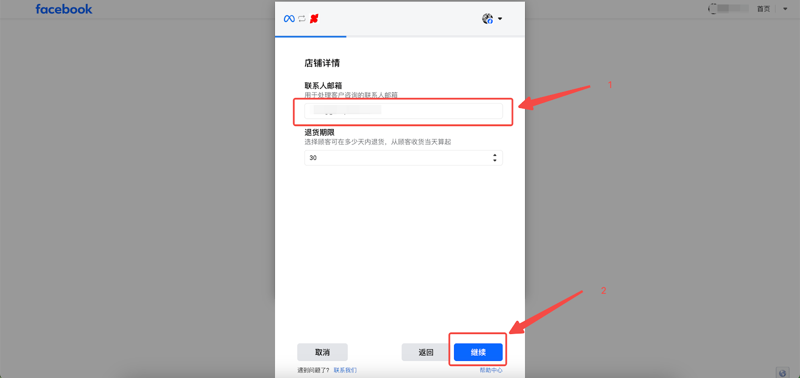 7. 输入店铺联系人邮箱,选择退货期限,点击【继续】。