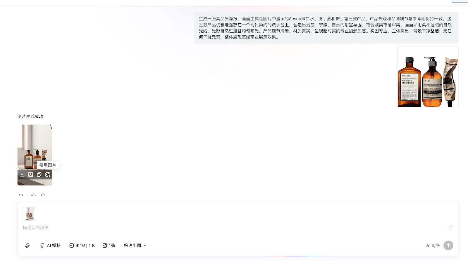 | 需要对生成的图片进行二次编辑 1. 建议鼠标hover到需要二次编辑的图片上,使用「引用图片」「复制图片」功能将图片重新添加到输入框中作为参考图进行二次编辑 a.有效避免对话中上下文的干扰导致生图混乱。 |