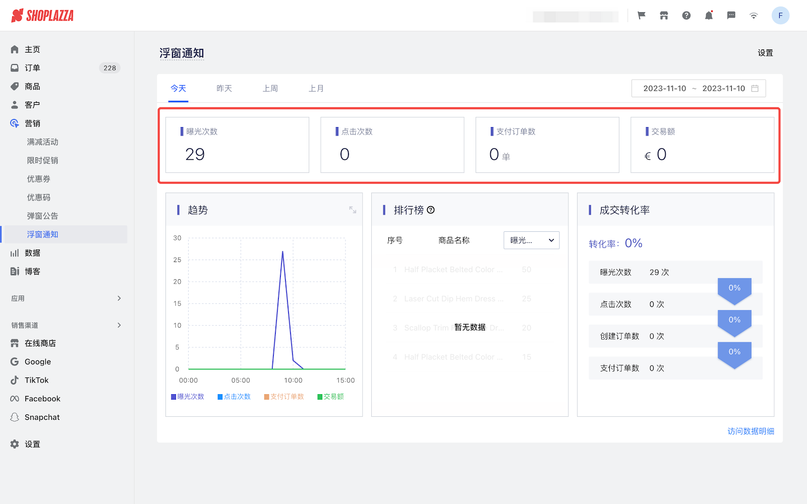 通过浮窗的数据报表,可以评估浮窗通知对于跨境电商客户下单的影响,利于店铺进行营销活动。以下内容为浮窗通知数据详情的概览: